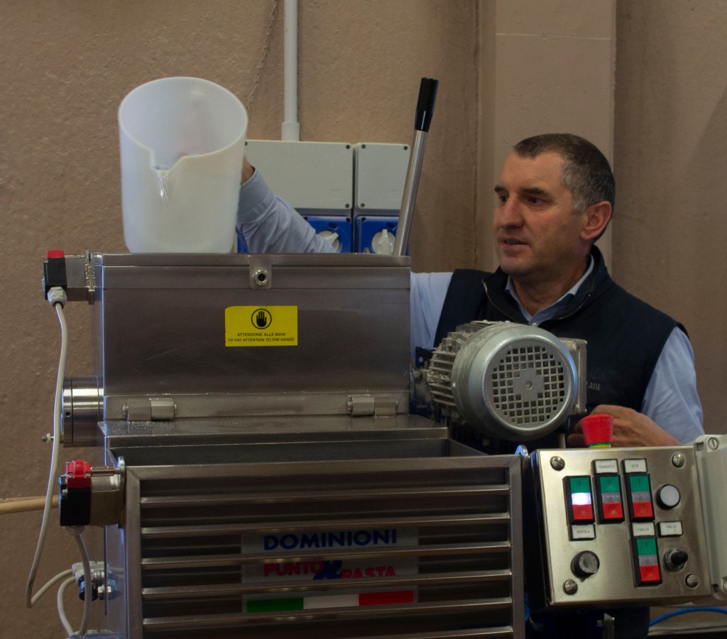 With the flour already inside the machine, Pagliaccia pours water into the top.